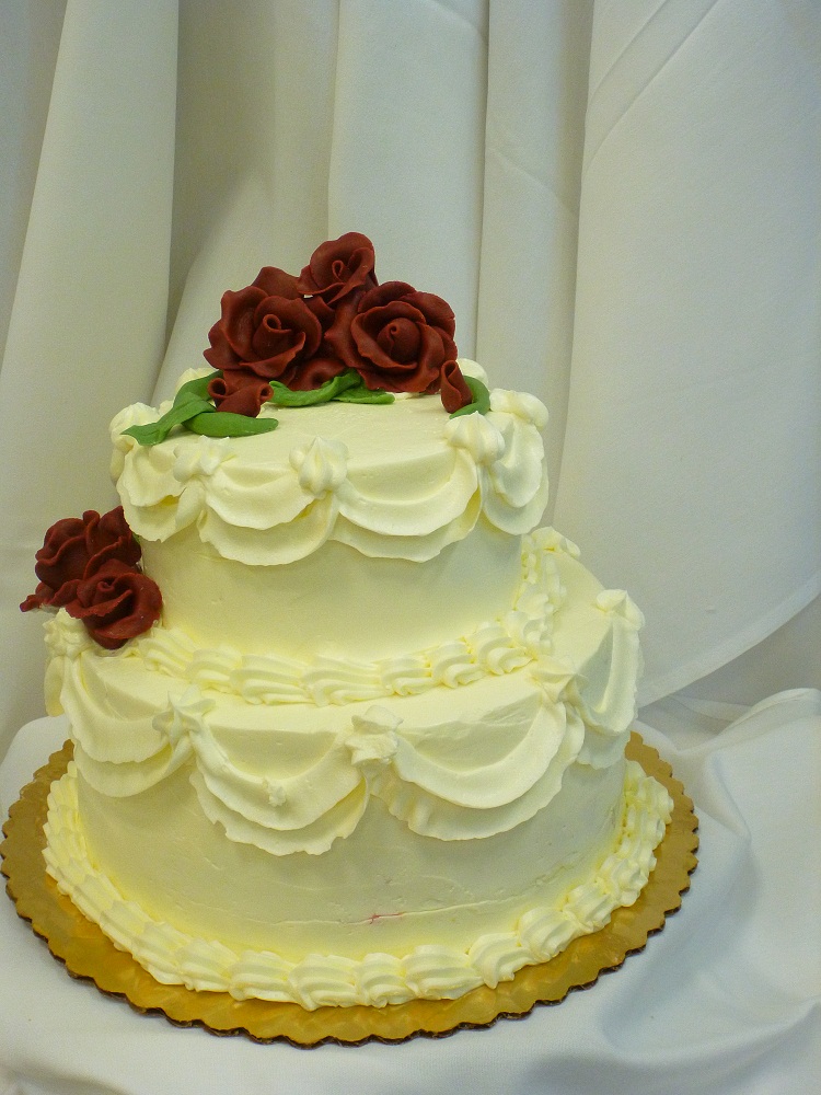 Swag cake today. It is simply iced in buttercream, covered in fondant and decorated with a fondant border (our choice of design) and buttercream swags.